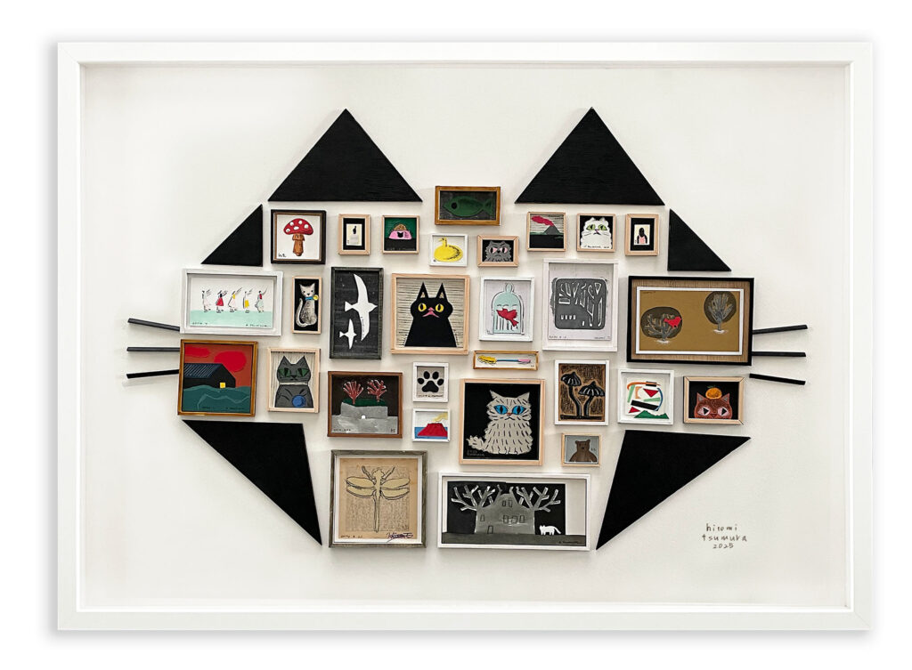 長年少しづつ制作していた小さな切り絵作品と今回展示テーマのねこに合わせて新しく切り絵作品を制作し、さらにねこのシルエットになるように配置してみました。
